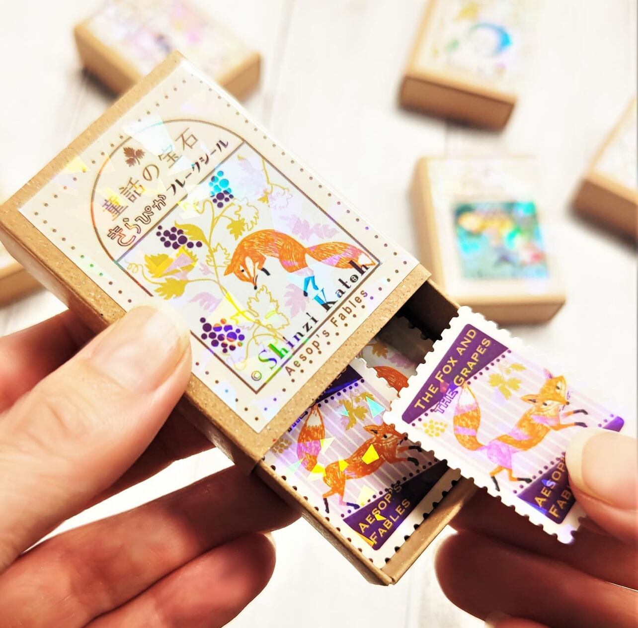 アンティーク調のケースに、切手型のフレークシールが詰まったきらぴかフレークシールです。箱やシールの表面に透明ホログラム加工を施し、宝石のような輝きを演出しています。